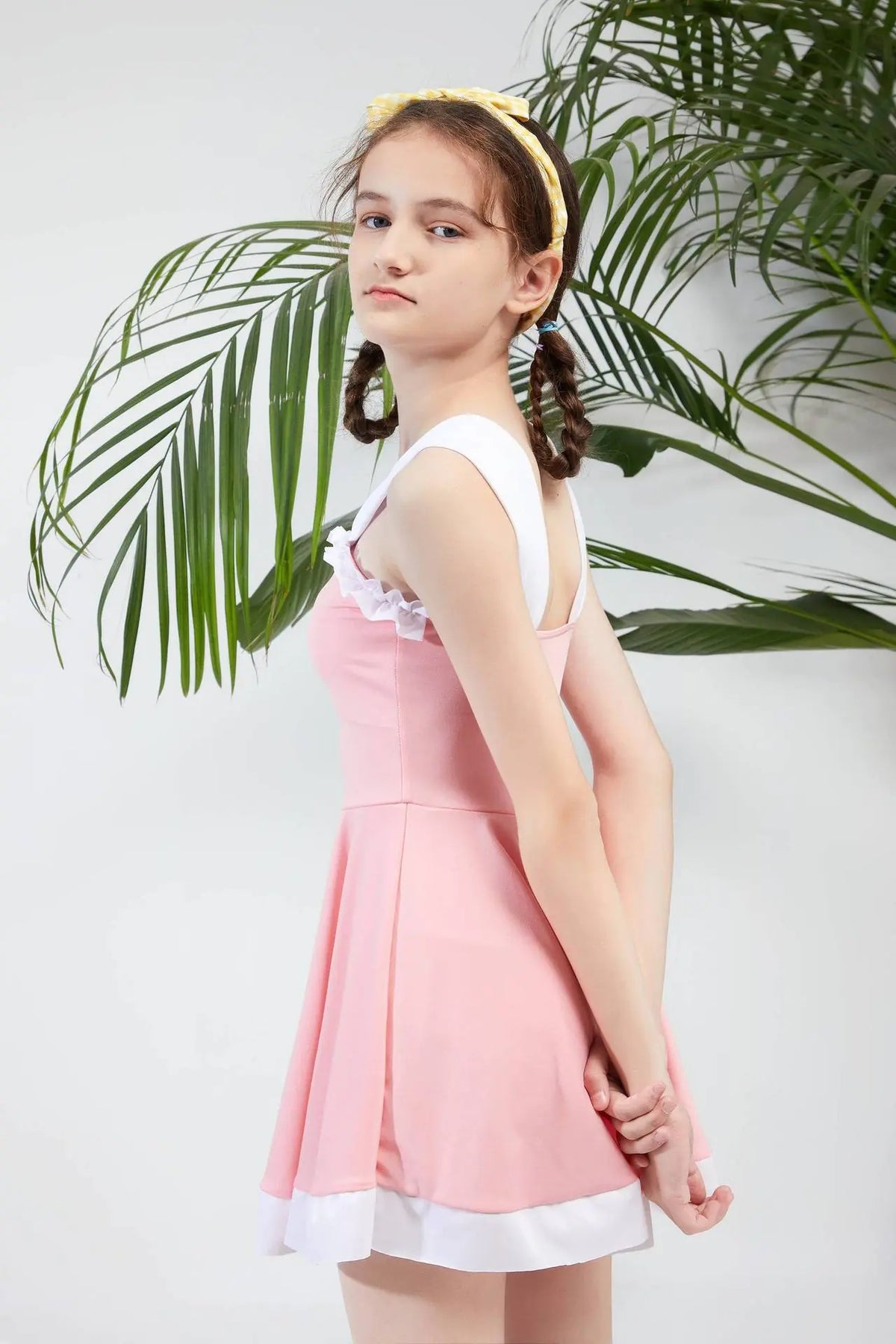 One-piece swimsuit designed for girls, featuring a solid color and a fresh, conservative style. Made from comfortable spandex with a...
